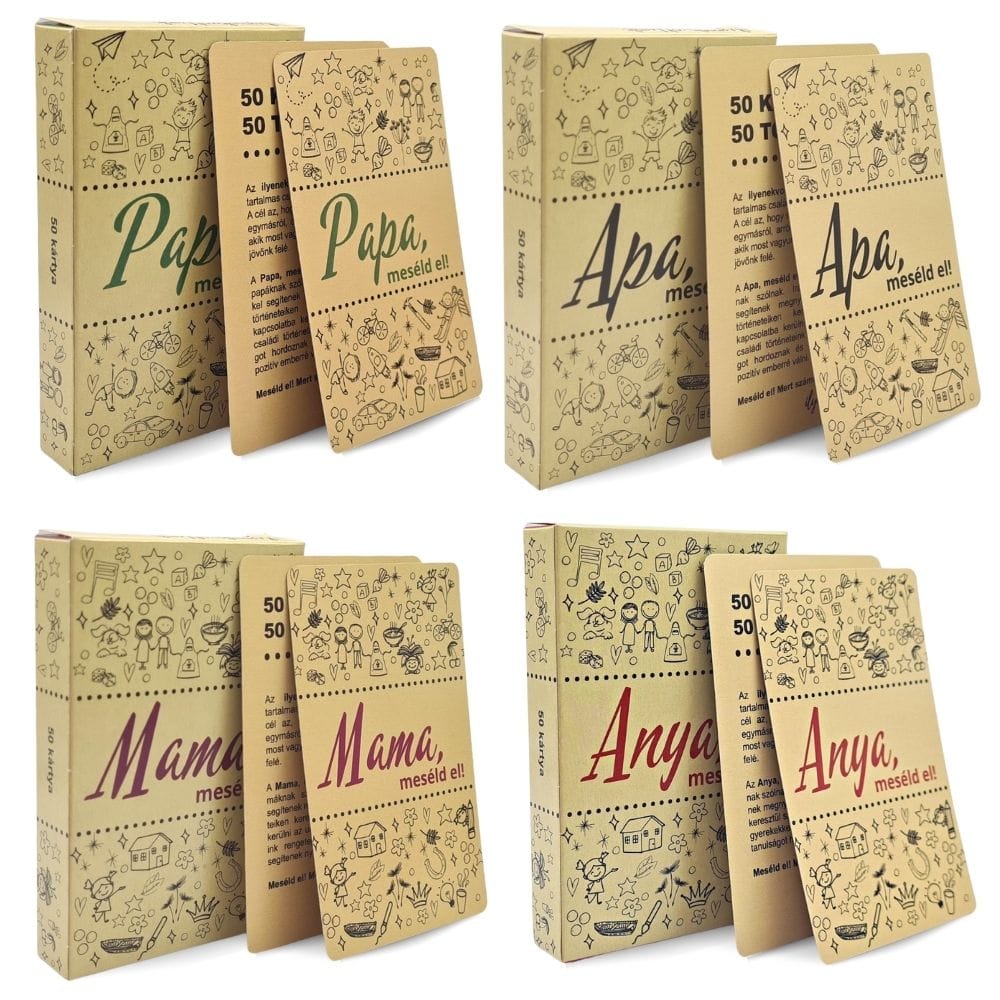 A Meséljük el! játékot kifejezetten többgenerációs közös játékra alkottuk – nagyszülők, szülők és gyerekek együtt idézhetik fel és oszthatják meg a családi történeteket.